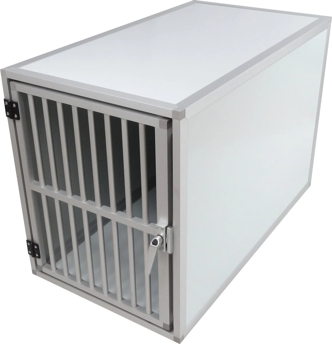 Kenmerken De bench is gemaakt van geanodiseerd aluminium met sterk plaat werk. De hond kan uit deze bench niet ontsnappen en bezeert zich niet aan het materiaal door de degelijke spijlen. Door het gladde materiaal is de bench erg makkelijk te reinigen. In de achterwand van de bench zijn spijlen 25cm geplaatst, om te zorgen voor een optimale luchtcirculatie.