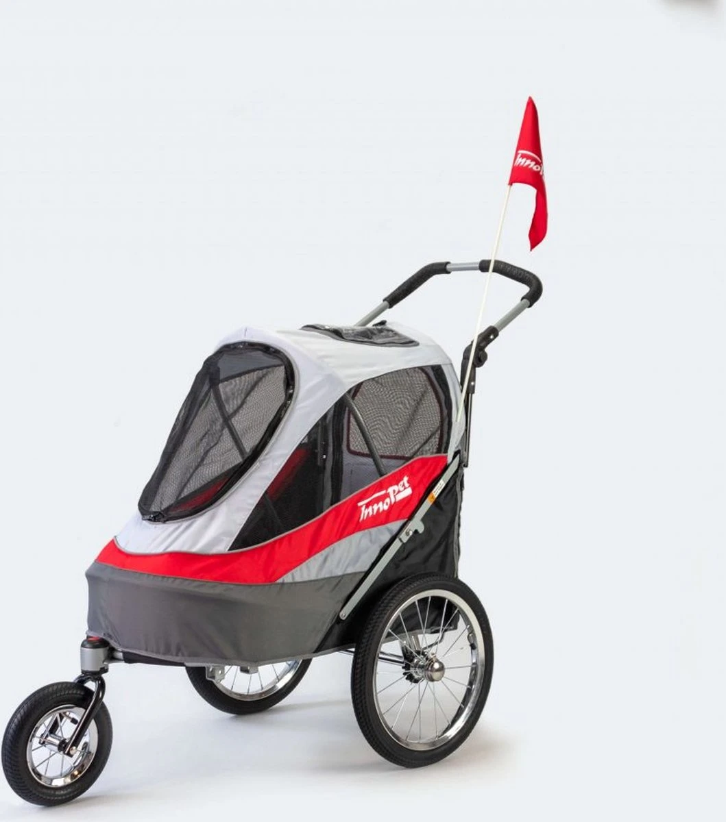 InnoPet Sporty Dog Trailer Deluxe – Hondenfietskar – Rood/Lichtgrijs – 71x44x63cm De InnoPet Sporty Dog Trailer Deluxe is een fietskar en een hondenbuggy in één. Het comfort van deze hondenfietskar is dankzij de luchtbanden erg hoog! De InnoPet fietskar wordt zeer compleet geleverd (Full Package Uitvoering). Het is tevens mogelijk om de fietskar aan een E-Bike te bevestigen. U dient er wel rekening mee te houden dat het koppelstuk alleen aan de kant bevestigd mag worden waar niet de aandrijving zit.