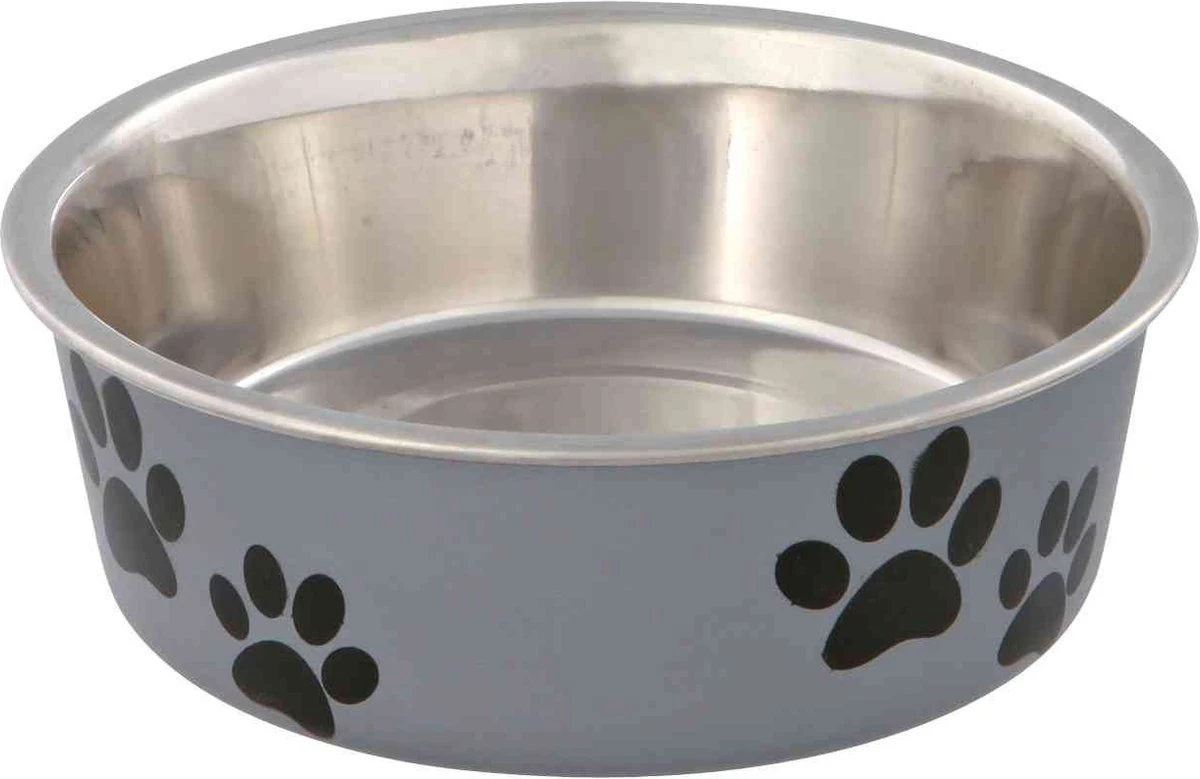 De Trixie Voerbak RVS / Kunststof Assorti 14 cm 450 ml per 4 st is een voerbak de hond, gemaakt van RVS met rubberen coating, slipvast door rubberen ring. De handige rubberen ring onder deze voerbak zorgt ervoor dat hij niet verschuift, wat zorgt voor comfortabel eten. De voerbak is gemaakt van RVS en dus gemakkelijk af te nemen. De buitenkant is voorzien van een rubberen coating met diverse leuke prints.